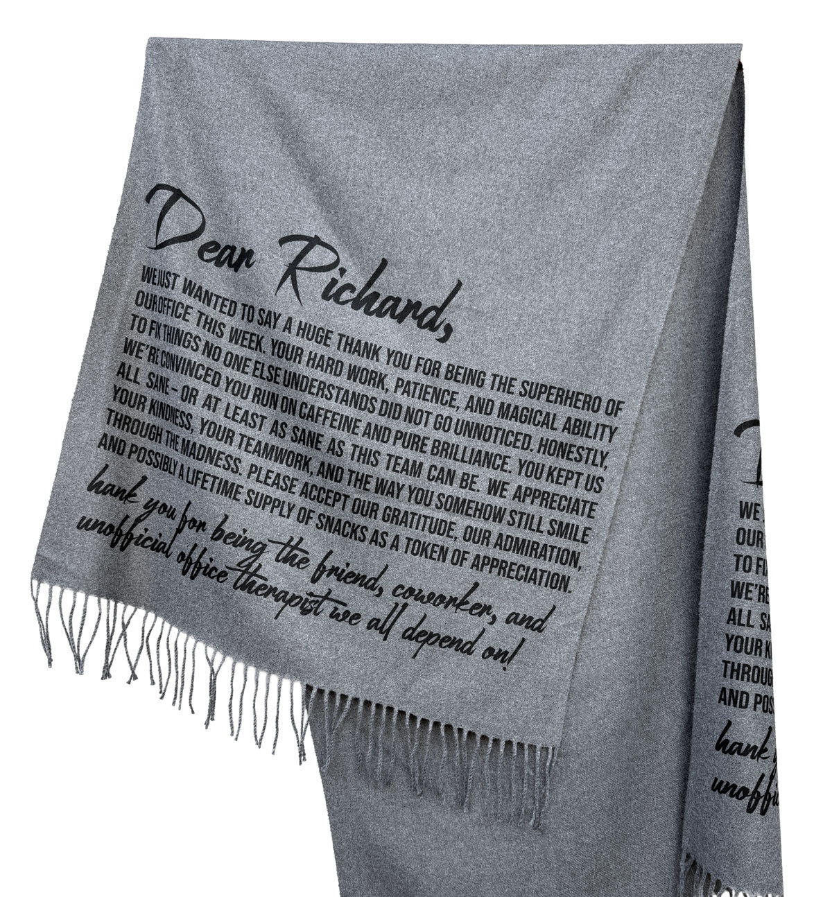 Select your scarf color, font color, and text style from our curated collection—or work with our designers to create something completely custom.